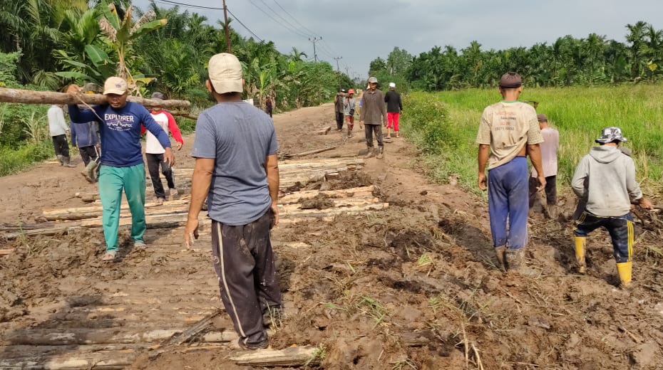 Para warga Desa Sungai Kepayang yang berjibaku gotong royong memperbaiki jalan yang rusak