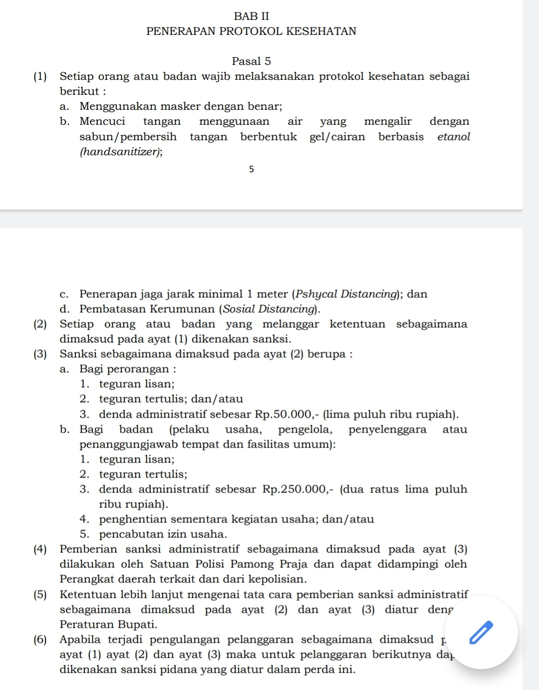Sebagaimana diketahui, dalam perda nomor 4 tahun 2020 tentang penegakan protokol kesehatan Covid-19 mengatur tentang protokol kesehatan dan sanksi administrasi mulai dari Rp.50 ribu dan untuk badan usaha didenda Rp.250 ribu. Sedangkan sanksi pidana mulai Rp.5 juta hingga Rp.10 juta dan hukuman kurungan mulai 3 bulan hingga 6 bulan bagi yang melanggar. (dul).