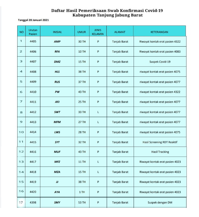 KUALATUNGKAL,RADARDESA.CO– Kasus positif COVID-19 di Kabupaten Tanjung Jabung Barat (Tanjabbar), Provinsi Jambi bertambah sebanyak 17 orang, Kamis (28/01).