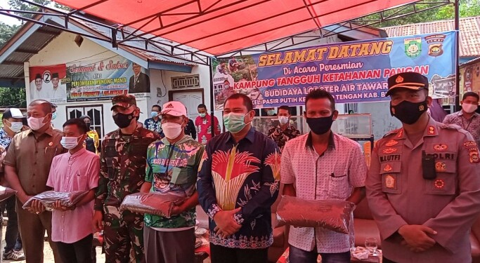MUARABUNGO,RADARDESA.CO-Kapolres Bungo AKBP Muhammad Lutfi meresmikan Kampung Tangguh Ketahanan Pangan Budidaya Lobster Air Tawar dan pemberian pakan ikan secara simbolis, yang di selenggarakan di Kelurahan Pasir Putih Kecamatan Rimbo Tengah Kabupaten Bungo, Kamis (4/3/2021).