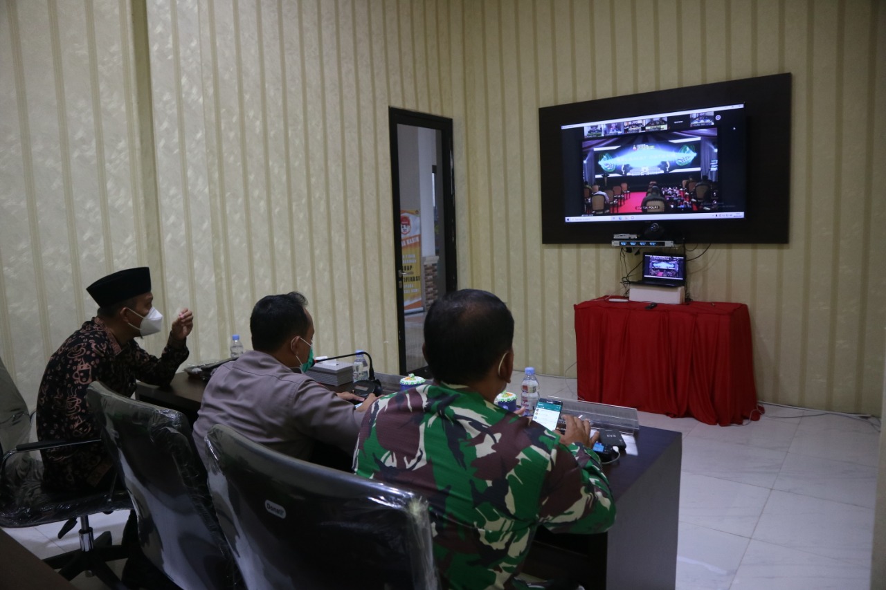 Kapolres Tanjung Jabung Barat AKBP Guntur Saputro dan Pasi Intel Kodim 0419/Tanjab Kapten Inf Boimin bersama Sekretaris Daerah Ir. H. Agus Sanusi MSi ikuti launching Layanan Polisi 110, secara virtual melalui video conference (Vidcon) di dari ruang Vidcon Polres Tanjung Jabung Barat, Kamis (20/5/21).