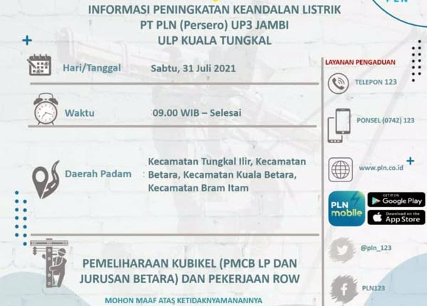 Manager PLN ULP Kuala Tungkal Rizki Tungguan menyampaikan, pemadaman aliran listrik ini akan dimulai sejak pukul 09.00 WIB hingga selesai pelerjaan.