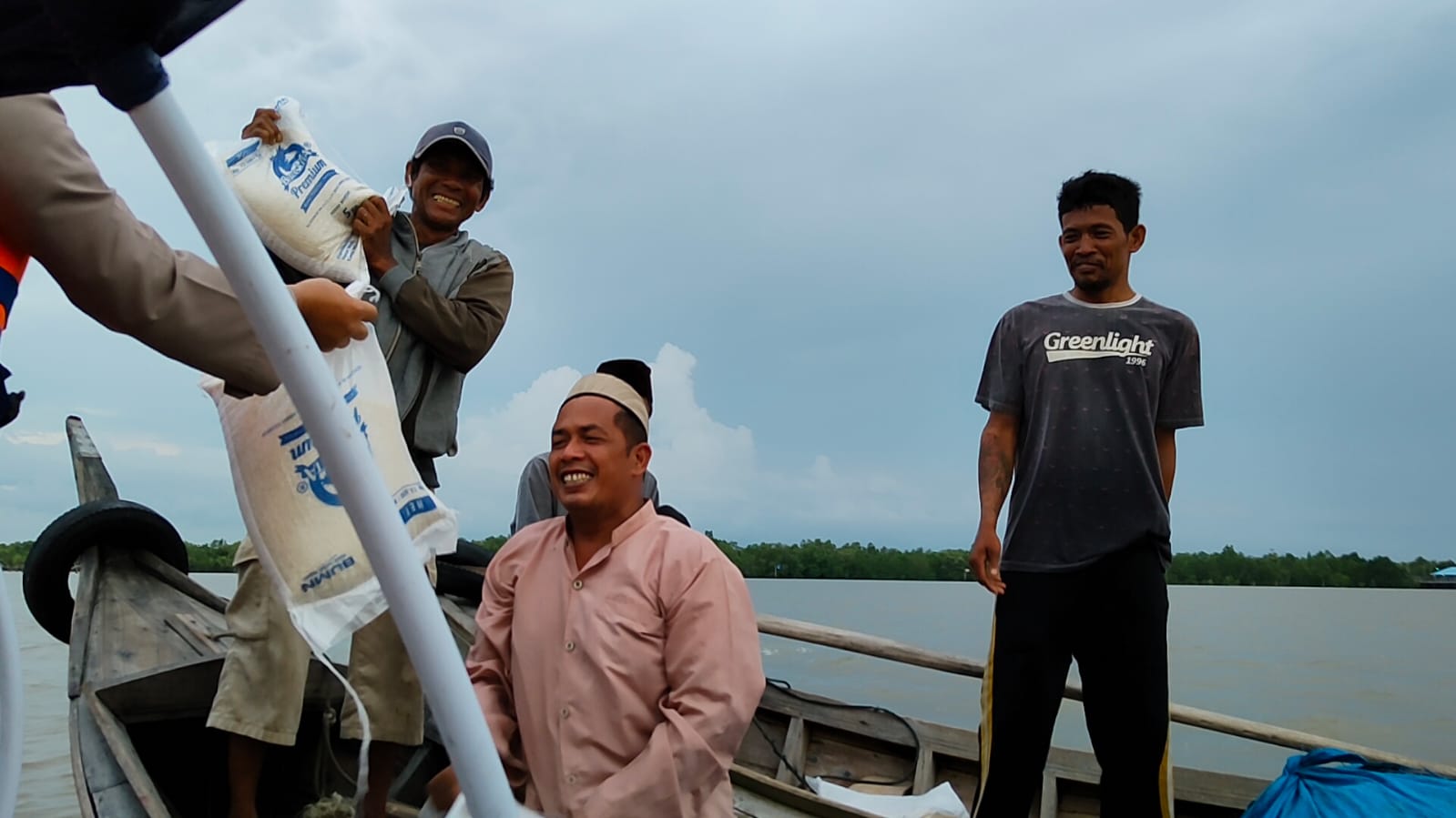 Kapolres Tanjabbar menyampaikan amanah dari Bapak Kapolda Jambi untuk memberikan beras kepada nelayan yang bekerja.