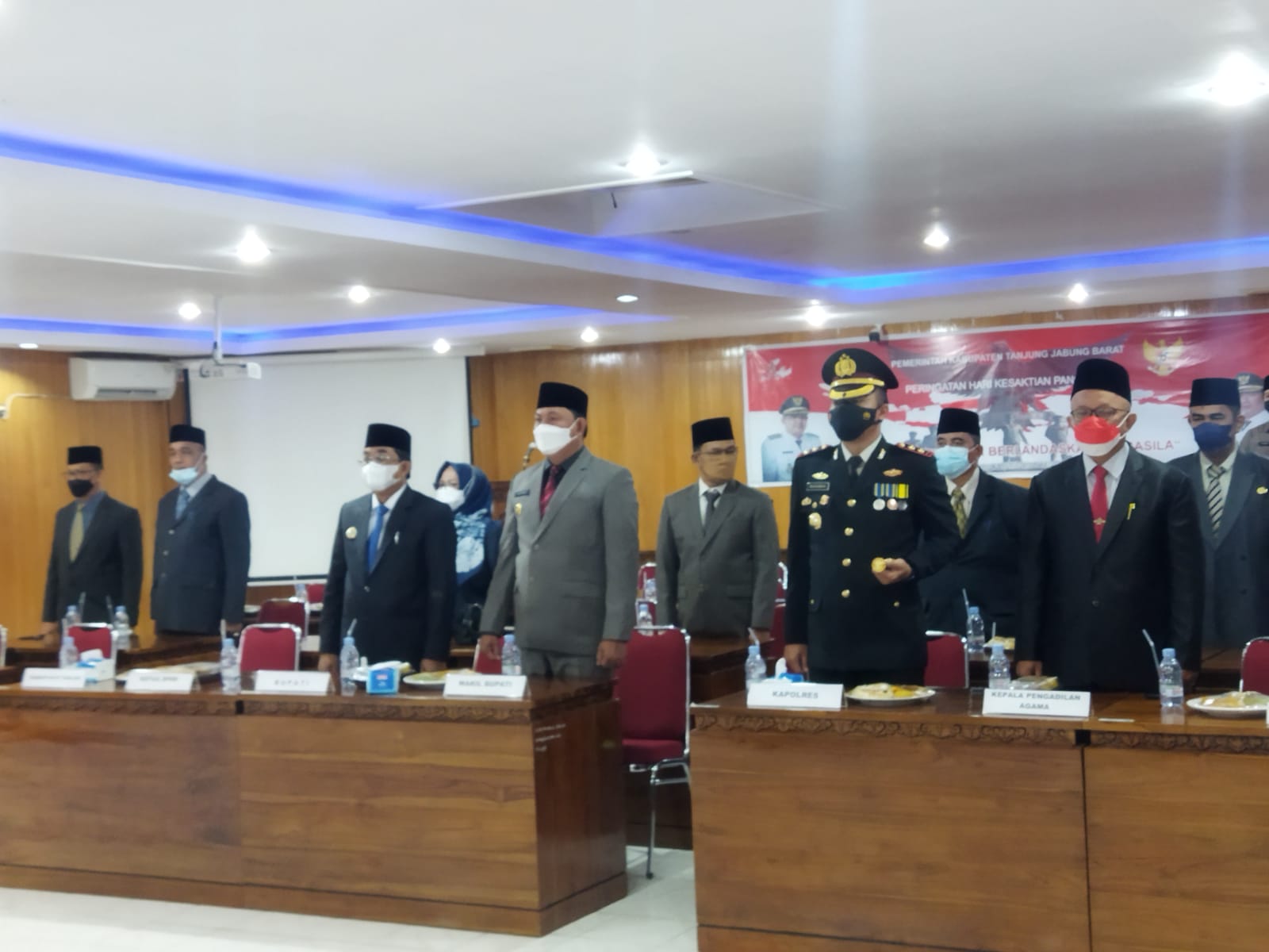 TANJAB BARAT, RADARDESA.CO – Bupati Tanjab Barat Drs. H. Anwar Sadat M.Ag ikuti Upacara Peringatan Hari Lahir Pancasila Tahun 2021 secara virtual yang dilaksanakan serentak seluruh indonesia dengan Tema ” Indonesia Tangguh Berlandaskan Pancasila”, Jumat (01/10/21).