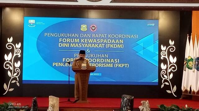 JAMBI,RADARDESA.CO – Gubernur Jambi, Al Haris mengajak Forum Kewaspadaan Dini Masyarakat (FKDM) dan Forum Komunikasi Pencegahan Terorisme (FKPT) untuk menjaga ketentraman masyarakat Provinsi Jambi. Hal tersebut disampaikan Al Haris pada acara Pengukuhan Forum Kewaspadaan Dini Masyarakat (FKDM) dan Forum Komunikasi Pencegahan Terorisme (FKPT), bertempat di Auditorium Rumah Dinas Gubernur Jambi, Selasa (22/03/2022).