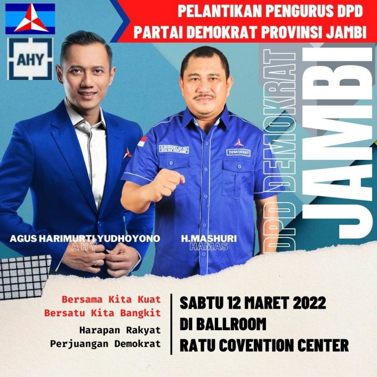 JAMBI,RADARDESA.CO – Kepengurusan DPD Partai Demokrat Provinsi Jambi dakan dilantik pada tanggal 12 Maret 2022 mendatang. Dari surat yang dilayangkan DPP Partai Demokrat nomor 14/BPOKK/DPP-PD/III/2022 kepada DPD Partai Demokrat Provinsi Jambi, tanggal sudah dipastikan.