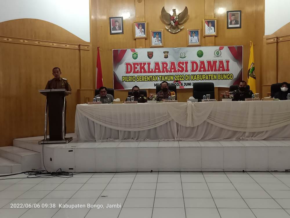 Kegiatan deklarasi damai pilrio berlangsung di ruang pola Kantor Bupati Bungo, disaksikan oleh Wakil Bupati Bungo H.Safrudin Dwi Aprianto,S.Pd Anggota DPRD Bungo, Dandim 0416 Bute Letkol Inf. Arianto Maskare Subagio, Kapolres Bungo AKBP Guntur Saputro Kejari Bungo, Ketua pengadilan negeri dan pengadilan agama Bungo, Sekda Bungo, Staf ahli Bupati, Asisten, Kadis PMD, para Kapolsek,Para Camat, serta para calon Datuk Rio yang mengikuti pilrio serentak.