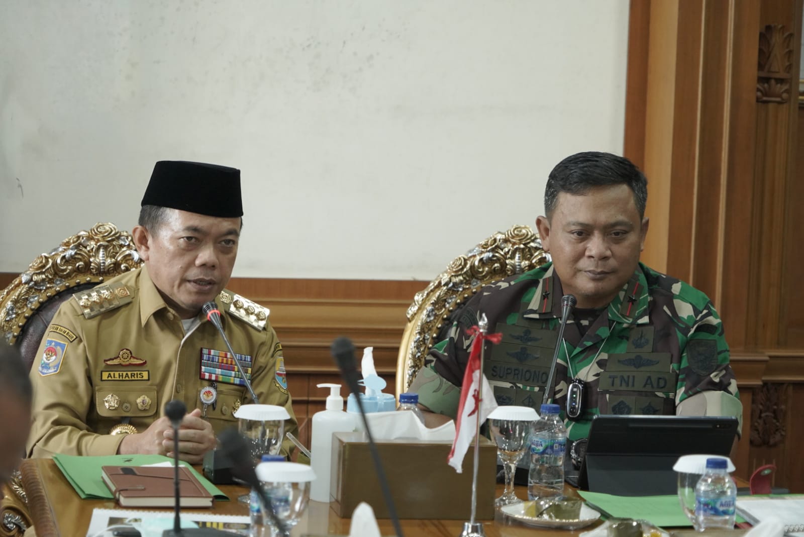 JAMBI, RADARDESA.CO – Bertempat di ruang rapat Gubernur Jambi, Danrem 042/Gapu Brigjen TNI Supriono bersama Gubernur Jambi Al Haris serta Sekda Provinsi Jambi Sudirman dan unsur terkait lainnya melakukan rapat koordinasi terkait kunjungan Kepala Staf TNI Angkatan Darat (KASAD) Jenderal TNI Dr. Dudung Abdurachman, S.E., M.M, Senin (11/7/2022).