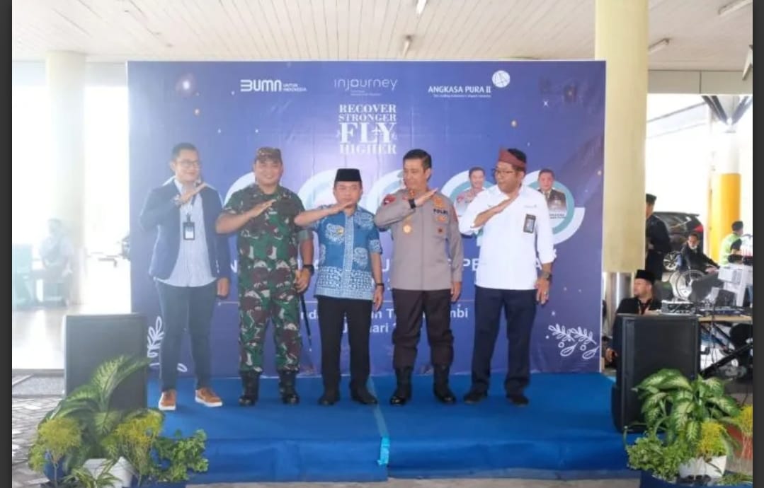 JAMBI – Gubernur Jambi Al Haris besama Kepala Kepolisian Daerah Jambi Irjen Pol. Rusdi Hartono, Danrem 042 Gapu Brigjen TNI. Supriono menyambut langsung penumpang pesawat pertama yang tiba di Provinsi Jambi pada awal Tahun 2023, Minggu (01/01/23) lalu.