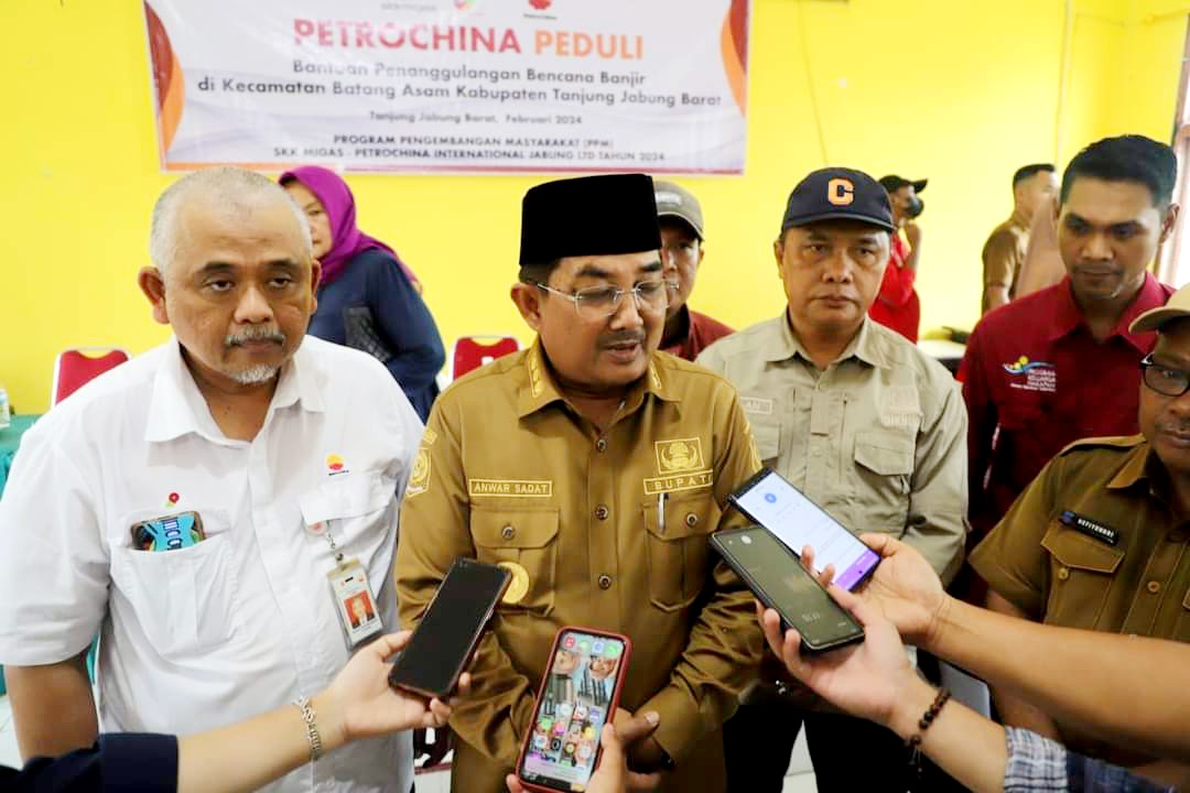 Bupati saat diwawancarai usai kegiatan mengatakan ada 229 Kepala Keluarga yang terdampak banjir dan bersyukur bisa memberikan bantuan berupa sembilan bahan pokok dari PetroChina International Jabung Ltd.