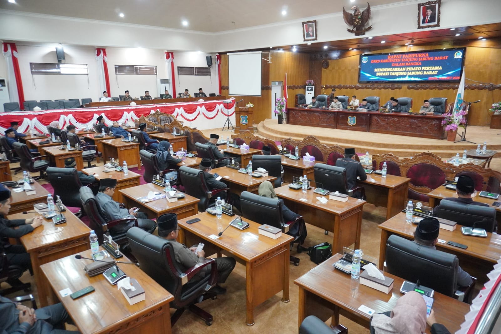 Ketua DPRD Tanjab Barat, Hamdani, SE, dalam sambutannya mengucapkan terima kasih kepada seluruh hadirin yang telah memenuhi undangan untuk menghadiri rapat paripurna ini. Ia menjelaskan bahwa berdasarkan hasil Rapat Badan Musyawarah DPRD pada 24 Februari 2025, telah ditetapkan jadwal pelaksanaan Rapat Paripurna untuk mendengarkan pidato perdana Bupati dan Wakil Bupati yang baru dilantik.