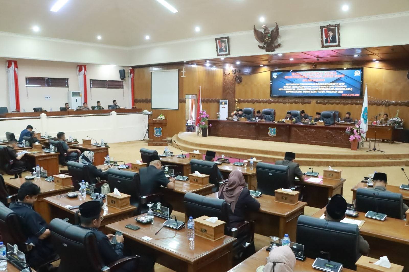 RADARDESA.CO, KUALA TUNGKAL – Bupati Tanjung Jabung Barat (Tanjab Barat), Drs. H. Anwar Sadat, M.Ag., didampingi Wakil Bupati Dr. H. Katamso, SA, S.E., M.E., menghadiri Rapat Paripurna Kedua DPRD Kabupaten Tanjung Jabung Barat dalam rangka penyampaian pemandangan umum fraksi-fraksi terhadap Nota Pengantar Laporan Keterangan Pertanggungjawaban (LKPJ) Bupati Tahun Anggaran 2025, Senin (06/04/2026).